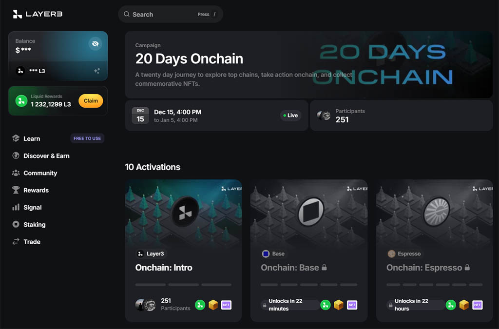 Квестовая платформа Layer3 запустила предновогоднюю кампанию 20 Days Onchain, которая содержит ончейн-задания в различных блокчейнах. За каждое выполненное задание, участники получают памятную NFT от платформы, которые в дальнейшем возможно повлияют на будущие аирдропы токенов L3.