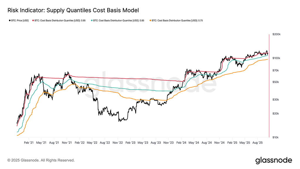 Это последнее падение особенно тревожно, поскольку это уже третий случай с конца августа, когда спотовая цена биткоина опускается ниже ценовой модели 0,95-квантиля ($117100) — уровня, при котором более 5% предложения, в основном принадлежащего крупнейшим покупателям, находится в убытке. Сейчас цена находится в диапазоне 0,85–0,95 квантиля ($108400–$117100), откатываясь от эйфорической фазы недавнего ралли.