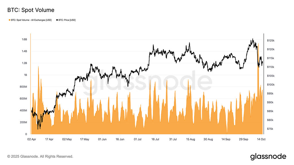 Во время недавнего каскада ликвидаций объёмы спотовых торгов резко возросли, достигнув одного из самых высоких уровней, зарегистрированных в этом году. Резкий скачок отражает высокую активность на рынке, поскольку трейдеры поспешили скорректировать позиции на фоне повышенной волатильности.