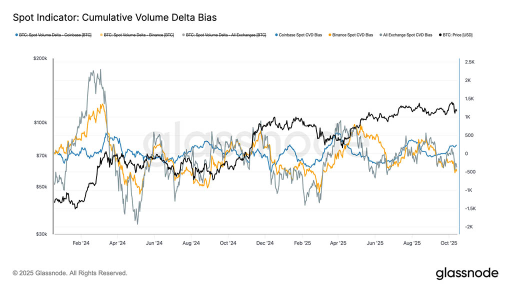 Сопоставление этого всплеска спотового объёма с показателем дельта-смещения кумулятивного объёма (CVDB), который измеряет отклонения от 90-дневной медианы совокупного торгового потока, выявляет заметное расхождение между основными биржами. Binance столкнулась с сильным давлением продавцов, в то время как на Coinbase наблюдалась чистая активность покупок, что свидетельствует о поглощении предложения институциональными участниками на американских площадках.