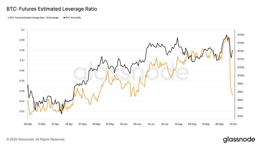 После резкого сокращения открытого интереса к фьючерсам, предполагаемый коэффициент кредитного плеча (открытый интерес к балансу на бирже) также упал до многомесячных минимумов. Это историческое событие по снижению кредитного плеча привело к устранению избыточного кредитного плеча в системе, ознаменовав один из крупнейших сбросов за одну сессию в истории.