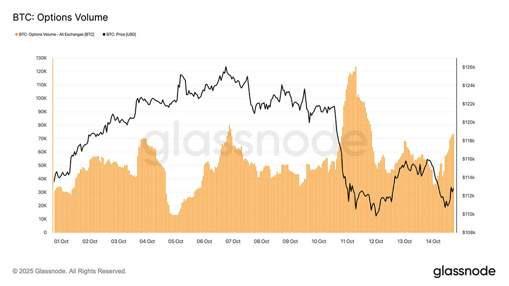 После быстрого роста открытого интереса рынок опционов пережил всплеск торговой активности на фоне резкого роста волатильности. После резкого падения биткоина в пятницу вечером объёмы торгов резко выросли в субботу, поскольку трейдеры стремились снизить риски. Данные демонстрируют явные всплески активности во время и сразу после распродажи.
