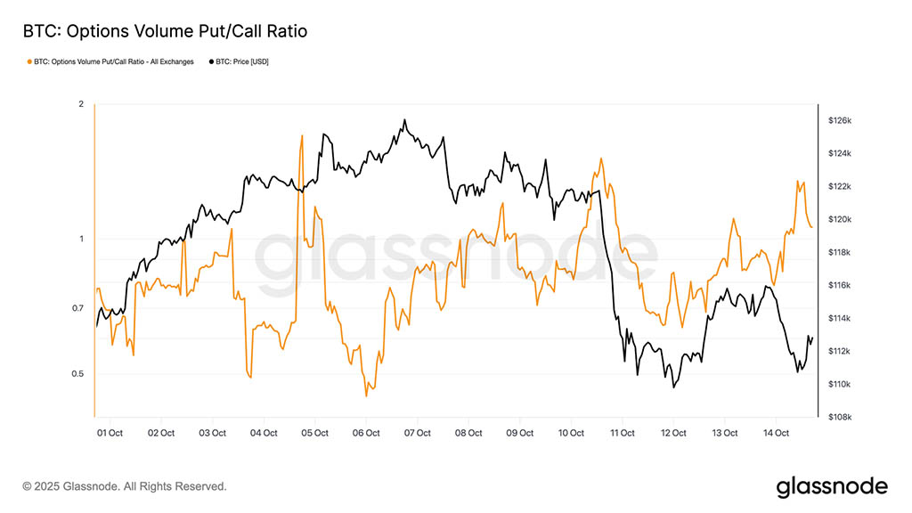 В пятницу, когда биткоин колебался около $121700, коэффициент подскочил выше 1,0, закрывшись на отметке 1,41 и достигнув пика около 1,51, по сравнению с примерно 0,8 в начале недели. Хотя такие резкие скачки не всегда являются предвестниками снижения, они часто сигнализируют о структурном стрессе или концентрированном хеджировании, указывая на то, что трейдеры активно готовились к риску ещё до начала более широкого каскада ликвидаций.