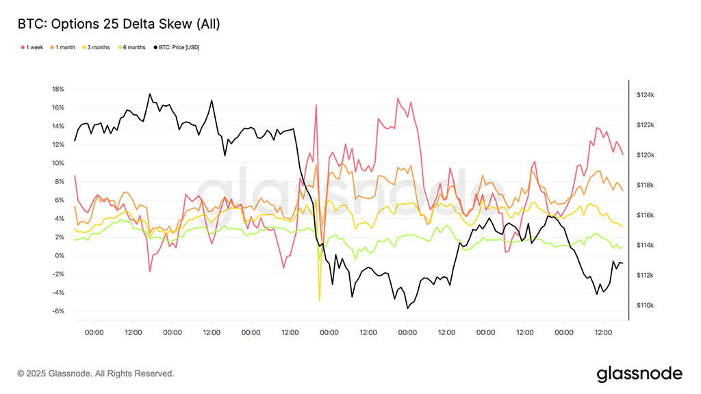 После резкого всплеска волатильности внимание переключается на перекос опционов, который наглядно отразил стремление трейдеров к защите. Перекос в 25 дельт (рассчитываемый как пут-колл ) резко возрос по срокам истечения после крупнейшей ликвидации в истории опционов на BTC на фоне резкого роста спроса на хеджирование снижения.