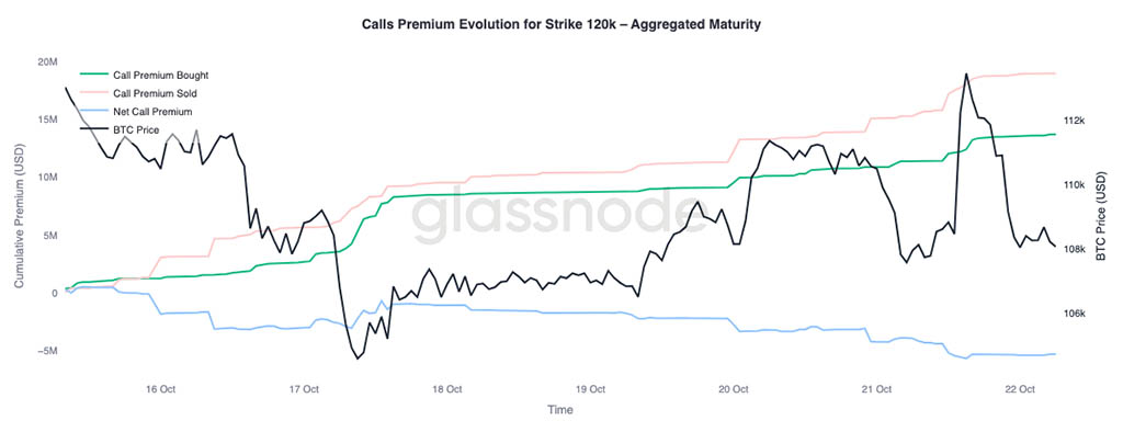 Агрегированные данные Glassnode по премиям подтверждают ту же тенденцию в разбивке по страйкам. При цене колл-опциона $120000, премии, проданные опционами, выросли вместе с ценой; трейдеры сглаживают рост цен и продают волатильность, чтобы поддержать её, считая её краткосрочной. Сторонники краткосрочной доходности пользуются скачками подразумеваемой волатильности, чтобы продавать колл-опционы во время ралли, а не гоняться за ростом.