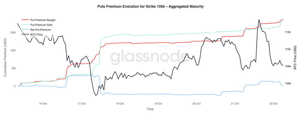 Эта структура отражает готовность рынка платить за защиту от падения, сохраняя при этом ограниченный потенциал роста, что позволяет сбалансировать краткосрочные опасения с по-прежнему уверенным долгосрочным прогнозом. Небольшой рост во вторник (21 октября) продемонстрировал, что, поскольку премии по опционам пут, снизились вдвое в течение нескольких часов, что свидетельствует о сохраняющейся нестабильности настроений.
