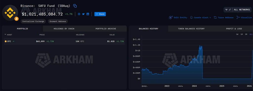 Как сообщила Binance в четверг в своем сообщении на X, в настоящее время фонд владеет 15 000 BTC, стоимость которых превышает $1 миллиард, приобретенными по средней совокупной себестоимости в $67000 за монету.