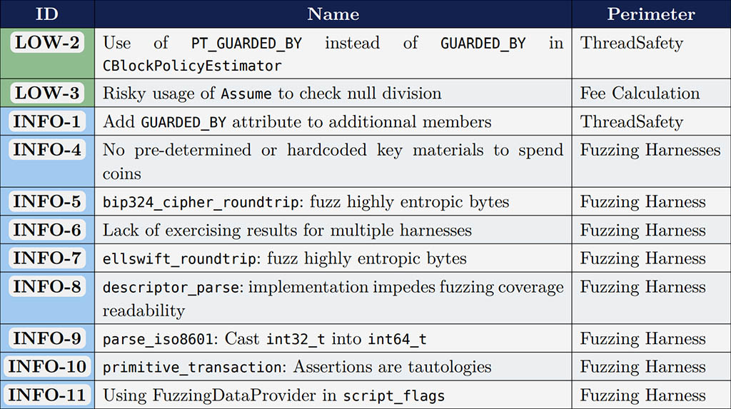 В ходе проверки, проведенной французской компанией Quarkslab, занимающейся безопасностью, по заказу OSTIF от имени Brink, были изучены наиболее уязвимые компоненты проекта, в частности уровень одноранговых сетей (P2P) и логика проверки блоков, в течение 104-дневного периода с мая по сентябрь.