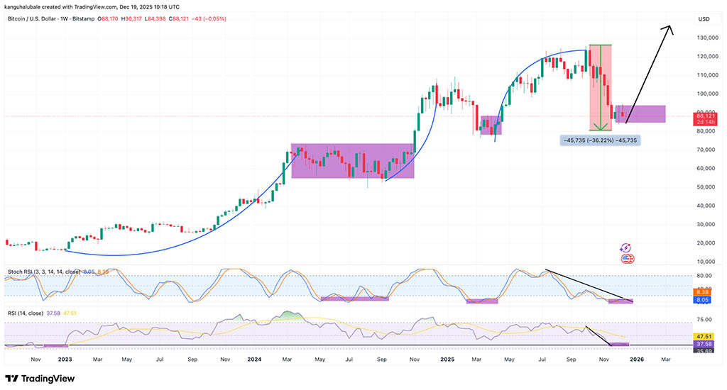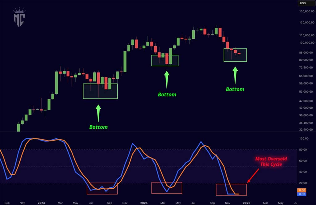 Mister Crypto написал в пятничном посте на X, имея в виду стохастический RSI, также показанный на двухнедельном графике ниже: