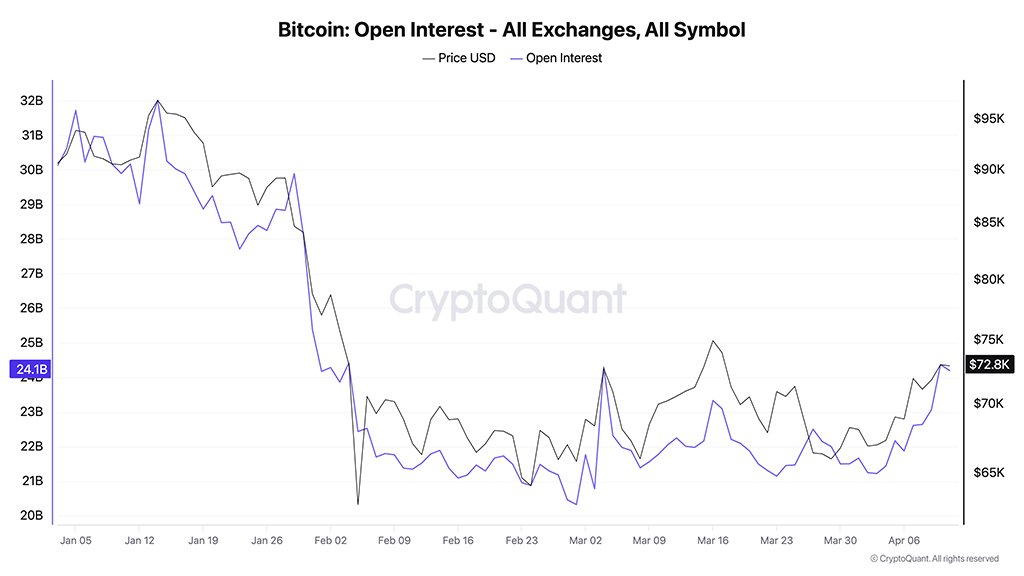 После того, как в пятницу курс BTC/USD превысил отметку в $73000, трейдеры, похоже, стремились поймать на месте тех, кто входил на рынок, рассчитывая на дальнейший рост цены. Ставки финансирования на биржах оставались отрицательными, а открытый интерес вырос до 24,2 миллиарда долларов — самого высокого уровня с начала марта.