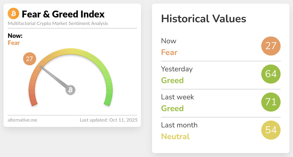 Индекс страха и жадности криптовалют, который измеряет общие настроения рынка, в своем субботнем обновлении упал до уровня «страха» 27, что представляет собой снижение на 37 пунктов по сравнению с пятничным значением «жадности» 64.