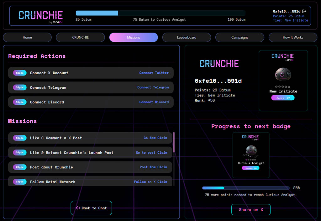 Datai Network запустила интерактивную маркетинговую кампанию, цель которой — вознаграждать пользователей за изучение ончейн-аналитики и выполнение различных заданий. Первая фаза кампании включает в себя ончейн-компаньона Crunchie на базе ИИ, который помогает пользователям анализировать ончейн-данные. Участвуя в кампании, пользователи накапливают поинты DATUM.