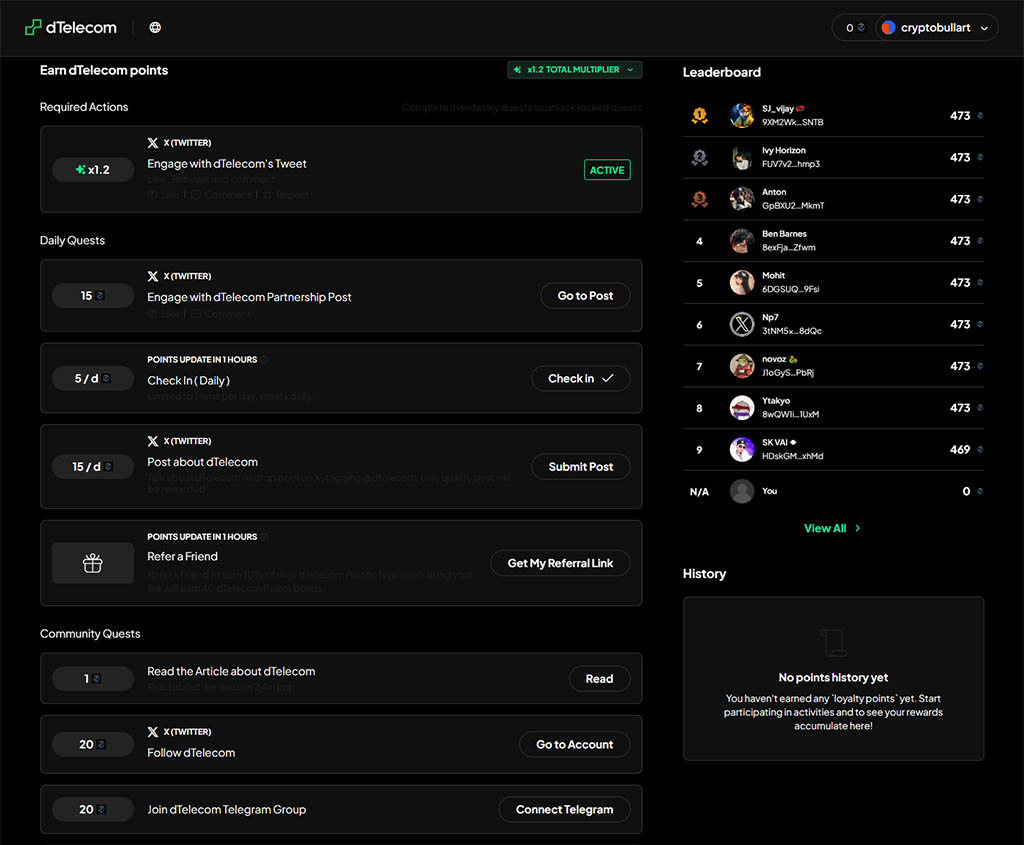1. Перейдите на страницу кампании dTelecom Reward Program и подключите кошелек и выполните обязательные условия: