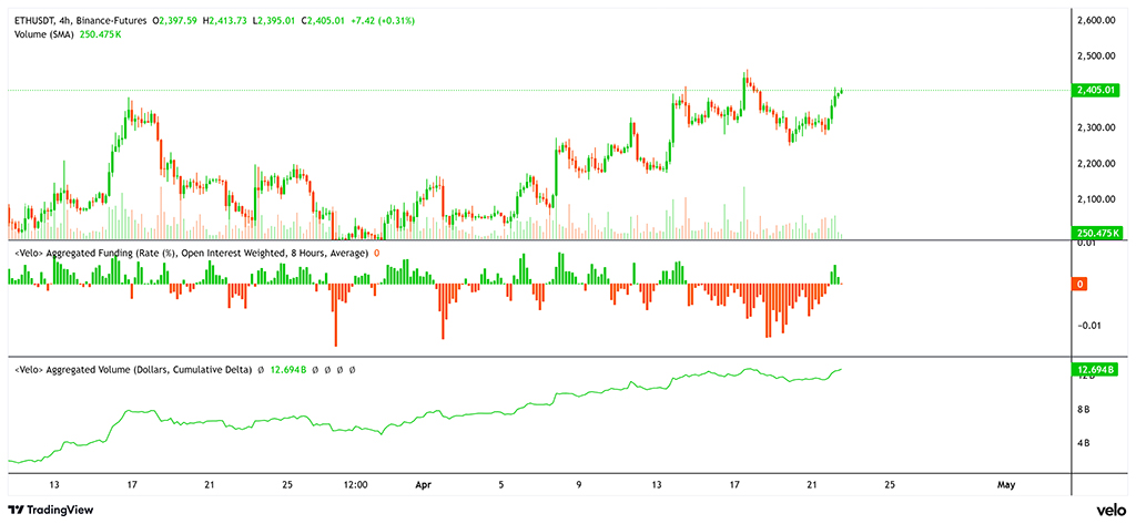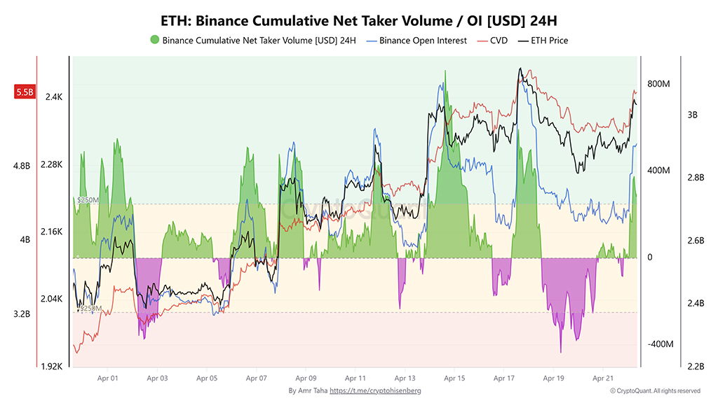 Фьючерсы ETH на Binance приблизились к двухмесячному максимуму, поскольку активность на рынке деривативов демонстрирует резкий рост агрессивных покупок. Объем сделок «покупка-тейкер» в апреле превысил $5 миллиардов, что свидетельствует о сильной поддержке покупателей во время консолидации цены ниже $2400.