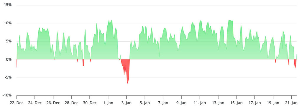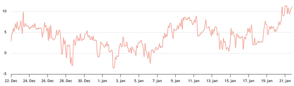 Чтобы подтвердить, перешли ли профессиональные трейдеры на медвежий рынок, следует оценить спрос на опционы на ETH. Когда крупные игроки и маркет-мейкеры опасаются дальнейшего падения, показатель асимметрии поднимается выше 8%, поскольку опционы пут торгуются с премией по сравнению с аналогичными опционами колл. Напротив, за бычьим рынком обычно следует индикатор асимметрии ниже -8%