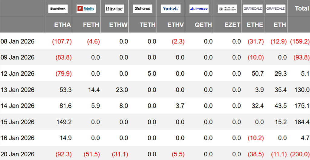 В пятницу из котируемых на американской бирже ETH-фондов, инвестирующих в Ethereum, был зафиксирован чистый отток средств в размере $230 миллионов, что изменило тенденцию предыдущей недели, когда средний чистый приток составлял $96 миллионов. Более тревожно то, что компании, которые сосредоточились на накоплении ETH в качестве резервной стратегии, столкнулись с крупными бухгалтерскими убытками, включая Bitmine Immersion (BMNR US) и Sharplink (SBET US).