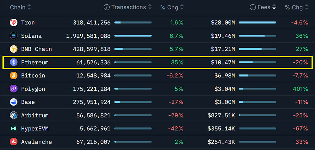 Согласно данным Nansen, комиссии сети Ethereum за прошедшую неделю снизились на 20%. В то же время у конкурента Solana комиссии выросли на 36%, а у BNB Chain — на 27%. Что еще более важно, лидерство Solana по объему транзакций остается неоспоримым, на фоне того, как суммарная сумма транзакций в блокчейне Ethereum и решений для масштабирования за семь дней составила менее $570 миллионов.
