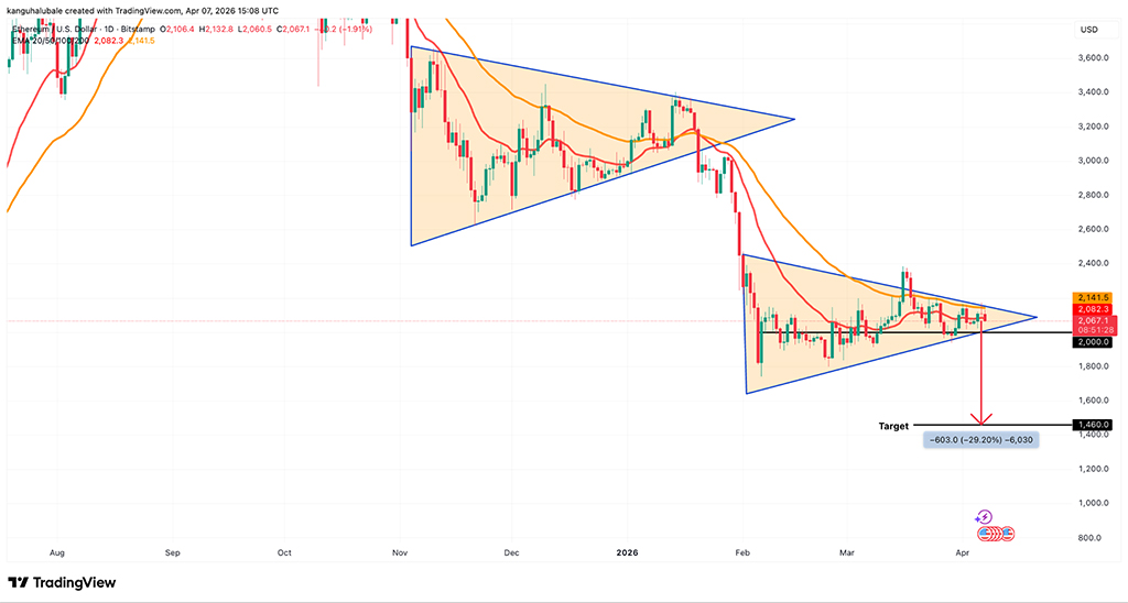 Если цена ETH упадет ниже этого уровня, она начнет стремительное падение к целевой отметке симметричного треугольника в $1460, что на 30% ниже текущей цены.
