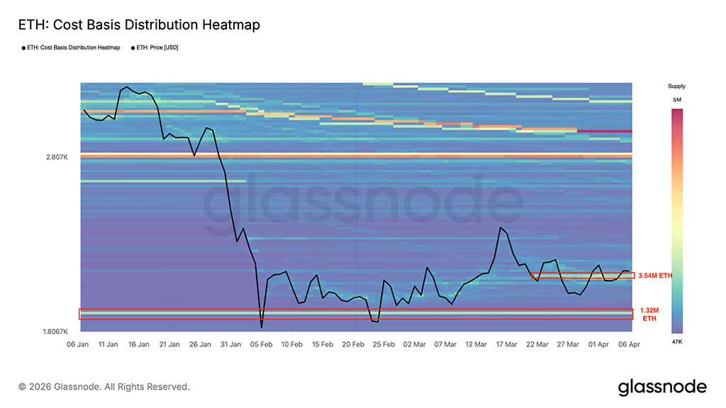 Важность этого уровня поддержки подтверждается распределением себестоимости. На приведенной ниже тепловой карте показано, что более 3,5 миллионов ETH были приобретены примерно за $2000.