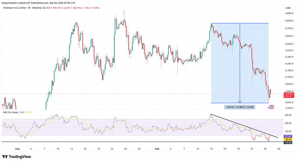 Падение ETH на 20% ниже $4000 с $4800 за последние две недели существенно повлияло на RSI на низких таймфреймах.