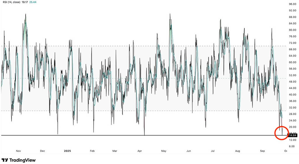 «Всего лишь в 19-й раз за 10 лет 4-часовой RSI $ETH опустился ниже 15 — редкий сигнал перепроданности».