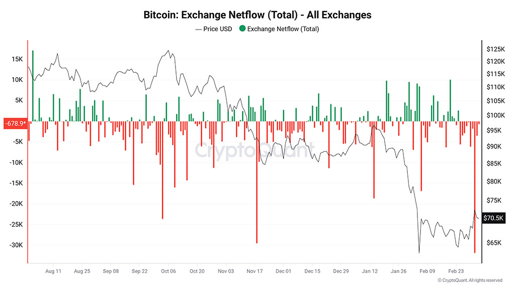 «Всплеск 4 марта (-31 900 BTC) является аномальным: однодневные события такого масштаба чаще всего связаны с крупными переводами позиций в холодное хранилище, хотя часть таких всплесков может отражать внутренние перемещения активов у депозитариев».