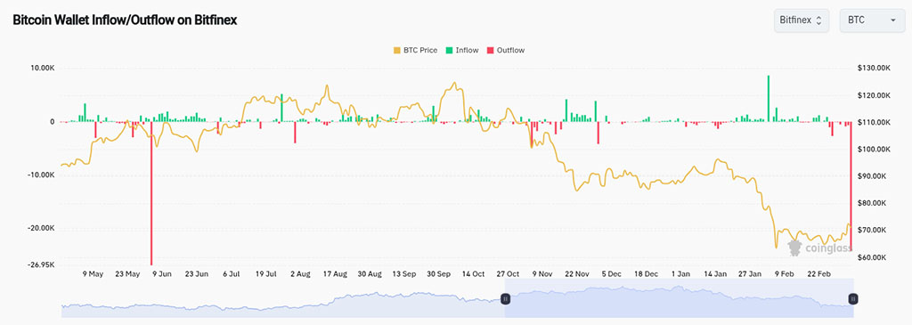 Данные CryptoQuant и CoinGlass подтвердили резкий отток средств в среду, причем местом оттока стала биржа Bitfinex. Этот отток стал крупнейшим для Bitfinex с июня 2025 года.