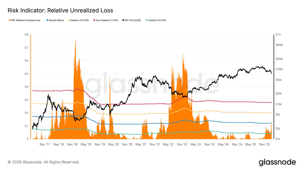В настоящее время относительный нереализованный убыток превысил свое долгосрочное циклическое среднее значение, близкое к 12%, что подтверждает растущее давление на инвесторов, владеющих монетами с себестоимостью выше текущей спотовой цены. Хотя уровень стресса явно повышен, исторический прецедент показывает, что движение к верхним пределам обычно совпадает с исключительными событиями, вызывающими сбои, такими как обвалы LUNA или FTX, когда цена быстро приближалась к реализованной цене.