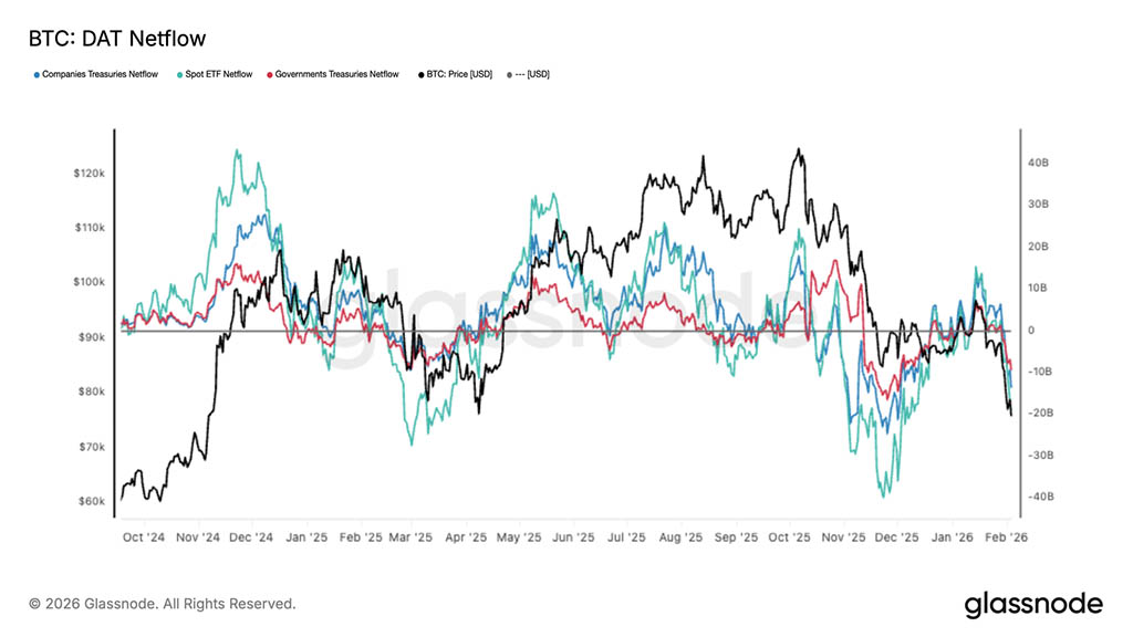 Спрос у основных инвесторов существенно снизился, и корзина DAT Netflow снова демонстрирует чистый отток средств на фоне падения BTC. Приток средств в спотовые ETF резко сократился, а корпоративные и государственные казначейства также теряют позиции, что свидетельствует о широкомасштабном сокращении маржинального спроса.