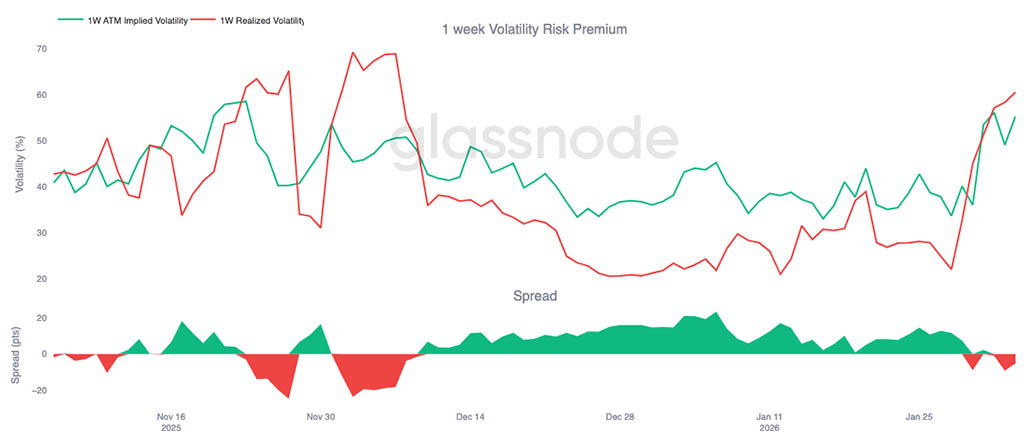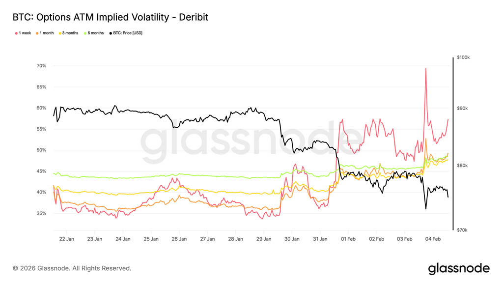 На рынках производных инструментов наблюдается все более хаотичная тенденция к продажам, а крупные ликвидации длинных позиций подтверждают, что кредитное плечо принудительно пересматривается. Хотя такое снижение кредитного плеча может устранить избыточную спекулятивную активность, само по себе оно не создает устойчивого нижнего предела. Рынки опционов отражают эту неопределенность: асимметрия снижения становится все более крутой, а подразумеваемая волатильность остается высокой, что сигнализирует о том, что трейдеры продолжают готовиться к дальнейшей турбулентности.