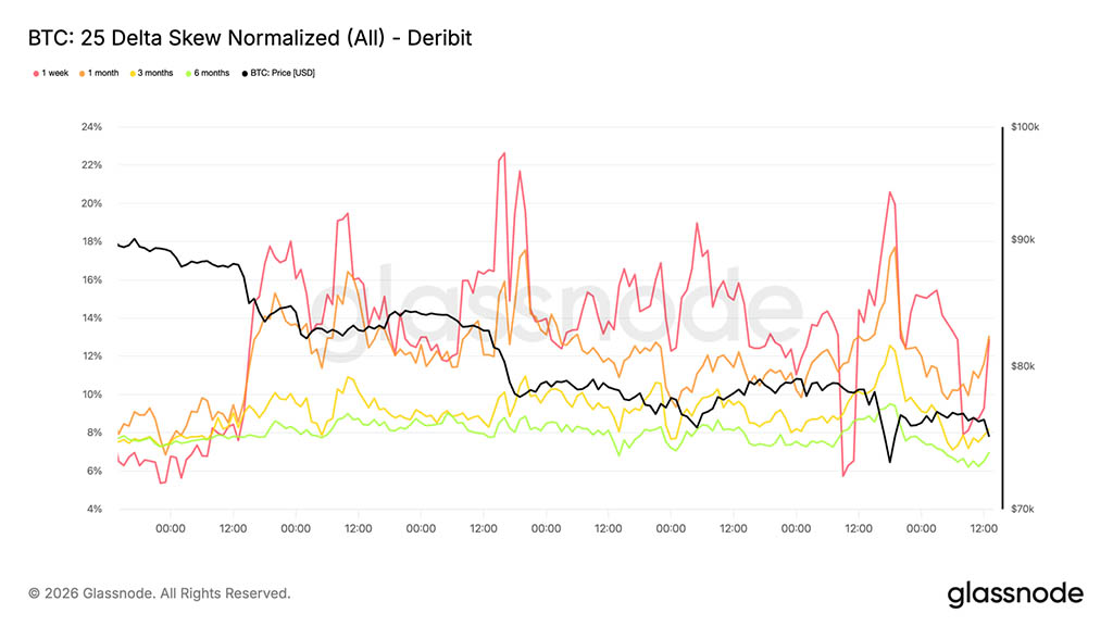 Вместо того чтобы смещаться в сторону спроса на колл-опционы, потоки опционов остаются сконцентрированными на защитных стратегиях. Это сохраняет подразумеваемое распределение смещенным в сторону негативных результатов и усиливает защитный настрой, уже наблюдаемый в волатильности на ближних позициях.
