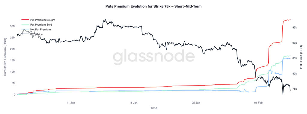 Давайте проанализируем поведение премии по пут-опционам в $75000, уровня, который в настоящее время активно оспаривается, поддерживается и неоднократно тестируется. Этот страйк стал очевидным ориентиром для краткосрочного позиционирования на риск.