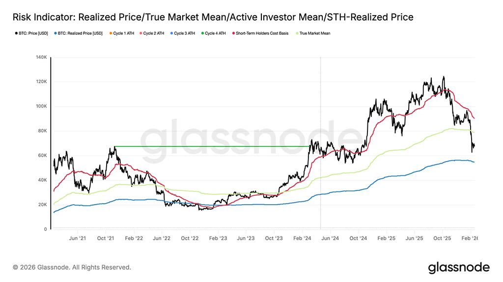 Биткоин по-прежнему находится в структурно определенном коридоре между истинным рыночным средним значением около $79000 и реализованной ценой около $54900. Пробой ниже активной себестоимости сместил режим в сторону жесткой защиты, и теперь цена полагается на кластер спроса в диапазоне $60000–$69000 для поглощения постоянного давления со стороны продавцов. Хотя эта зона пока сдерживает нисходящий импульс, уверенность остается хрупкой.