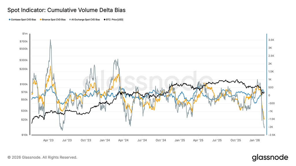 Примечательно, что спотовая ставка CVD на Coinbase также снизилась, что свидетельствует о том, что спрос в США больше не является постоянным противовесом глобальному давлению со стороны продавцов. Совпадение отрицательной ставки CVD на разных площадках предполагает, что недавнее ослабление обусловлено активным распределением, а не дефицитом пассивной ликвидности.