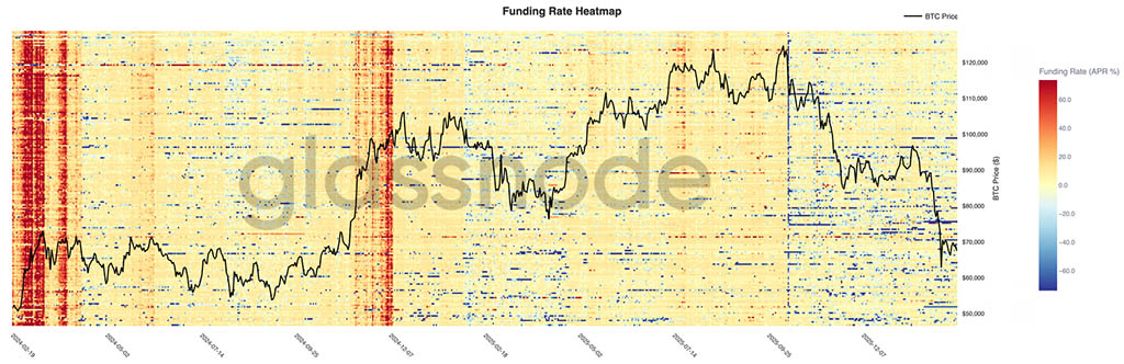 Ставки по бессрочным контрактам резко снизились на различных площадках, при этом тепловая карта показывает широкий сдвиг от устойчиво положительного уровня финансирования во время роста до $120000 до все более нейтральных и отрицательных значений по мере коррекции цены до $70000. Этот переход отражает существенное сокращение длинных позиций.