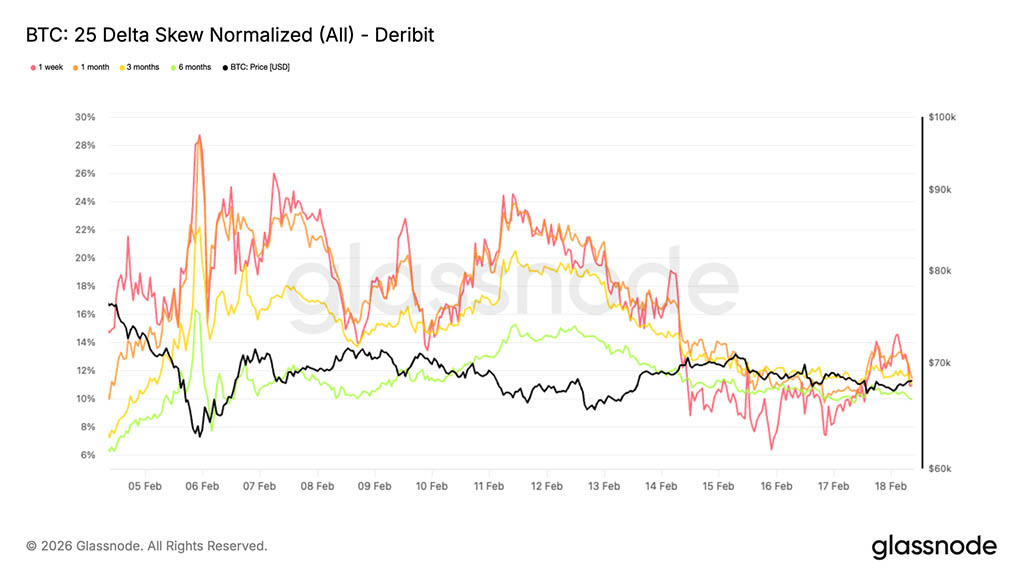 После повторного тестирования диапазона $60000 асимметрия распределения оставалась около 20%. С тех пор она снизилась примерно до 11% по всем срокам, что свидетельствует о резком снижении на 9 пунктов за последние торговые сессии.