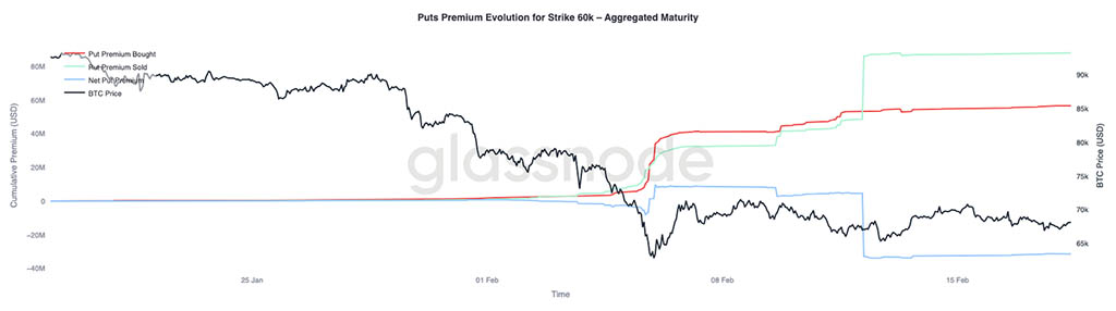 При более детальном рассмотрении динамики премии по пут-опционам в размере $60000 становится яснее изменение поведения участников рынка. Во время и сразу после обвала рынка преобладали потоки средств, полученные за покупку пут-опционов, поскольку трейдеры активно накапливали защиту от падения цен на этом страйке, усиливая спрос на страхование от обвала.