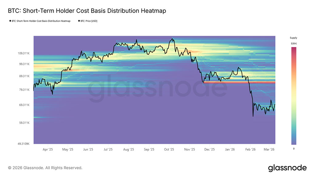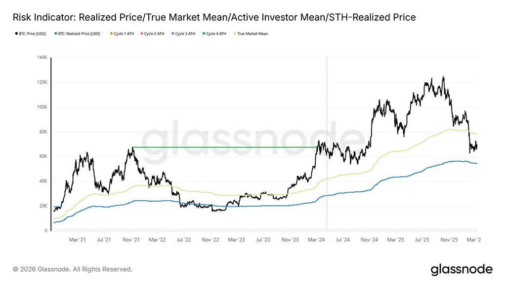 Биткоин более месяца консолидировался в диапазоне $62800–$72600, неоднократно предпринимая неудачные попытки закрепиться выше $70000, каждая из которых сопровождалась кратковременными скачками чистой реализованной прибыли, превышающими $5 млн в час, что указывает на оппортунистическую фиксацию прибыли, а не на устойчивый спрос. В целом, цена в настоящее время находится между двумя структурно значимыми моделями себестоимости: реализованной ценой на уровне $54400, представляющей среднюю стоимость приобретения всех находящихся в обращении монет, и истинным рыночным средним значением на уровне $78400, которое отслеживает себестоимость активно торгуемых монет.