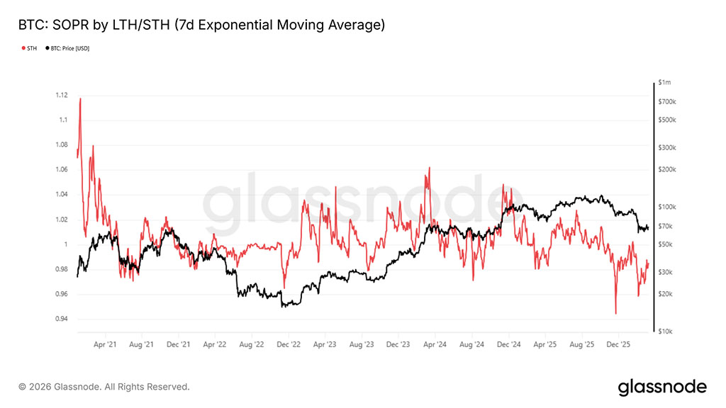 • Семидневная скользящая средняя (7D-EMA) STH-SOPR остается ниже 1 с октября 2025 года и сейчас составляет 0,985, что подтверждает, что недавние покупатели тратят деньги в убыток — характерный признак медвежьего рынка.