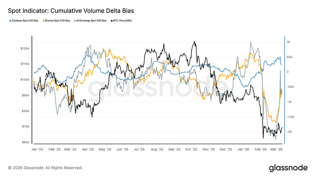 Однако в последние дни спотовая ставка CVD начала разворачиваться вверх, что указывает на то, что покупатели начинают поглощать ликвидность со стороны продавцов. Восстановление особенно заметно на глобальных биржевых платформах, что свидетельствует о широкомасштабном улучшении спотового спроса, а не об изолированной активности на биржах.