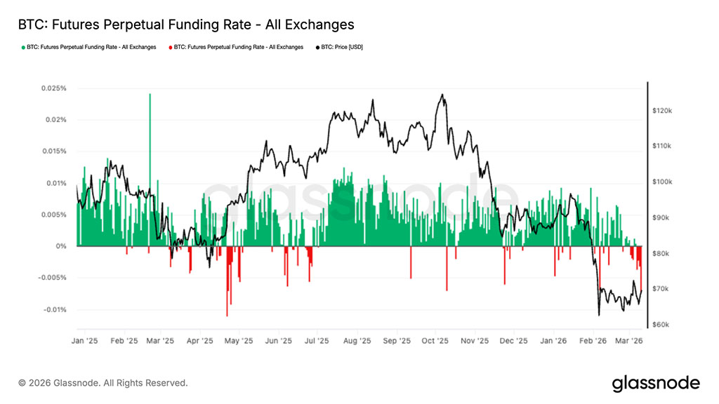 Ставки финансирования по бессрочным фьючерсам в последние торговые сессии заметно снизились, отражая растущее доминирование коротких позиций на рынках производных инструментов. Это изменение происходит на фоне того, что биткоин торгуется вблизи нижней границы своего недавнего диапазона после резкого падения до уровня $60000–$70000.