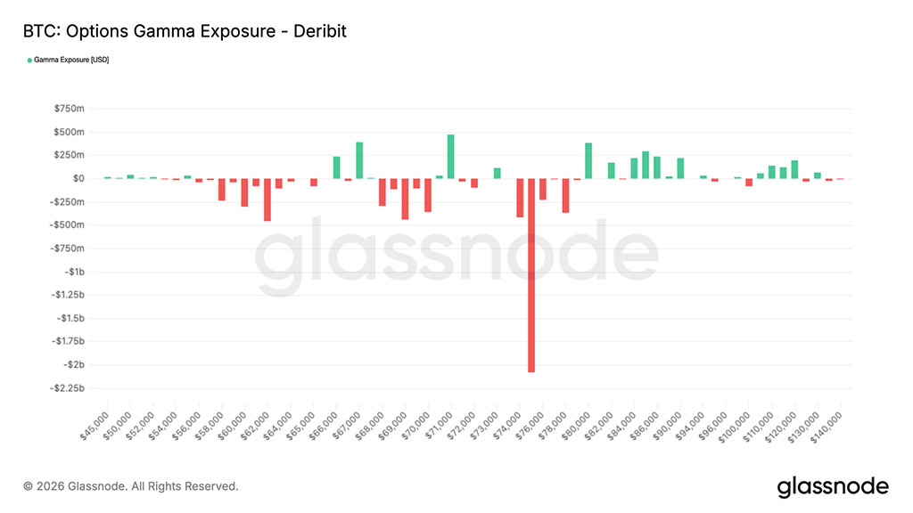 В районе страйка $75000 сосредоточено примерно $2 миллиарда отрицательной гаммы. В короткой зоне гаммы потоки хеджирования дилеров усиливают движение. Если цена достигнет этого уровня, активность хеджирования может ускорить движение вверх к отметке $80000.