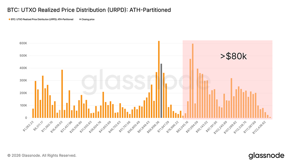 В условиях консолидации цен в диапазоне $60000–$70000, в этом отчете мы отходим от анализа краткосрочной динамики цен и оцениваем структурные факторы, формирующие текущую рыночную ситуацию. Как отмечалось в последних выпусках, одним из наиболее устойчивых факторов, сдерживающих рост, является значительный объем предложения, приобретенного по цене выше $80000, который в настоящее время удерживается с нереализованным убытком.