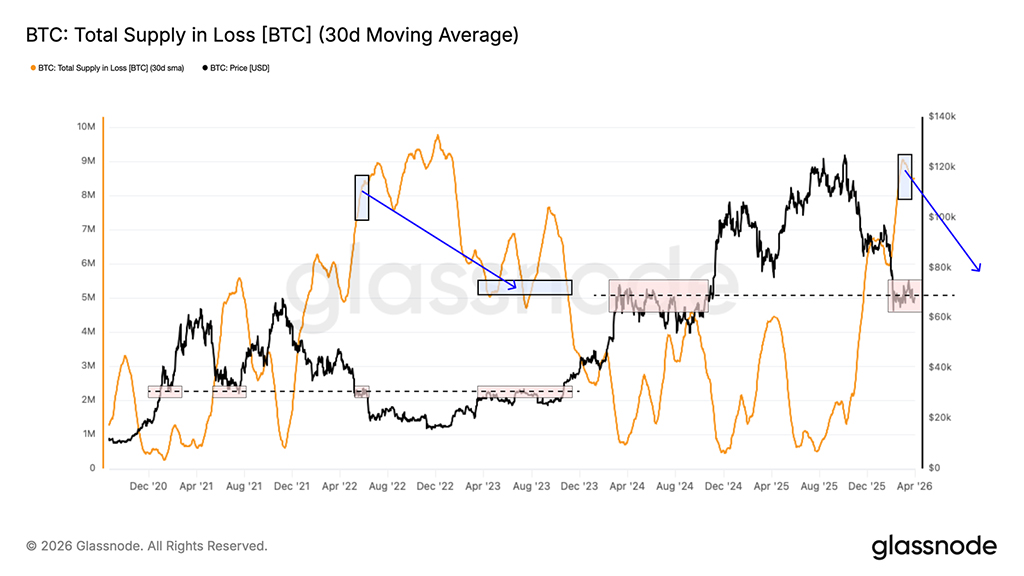Для точной количественной оценки избыточного предложения используется показатель «Общее предложение в убытке» (Total Supply in Loss), который подсчитывает объем находящихся в обращении биткоинов, цена которых в последний раз превышала текущий спотовый уровень. Применяя 30-дневную скользящую среднюю для сглаживания краткосрочных колебаний, этот индикатор в настоящее время показывает приблизительно 8,4 млн BTC, что означает, что примерно от 8 до 9 млн монет оставались в убытке на протяжении последнего месяца.