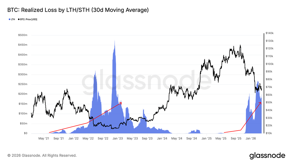 • Фактические убытки LTH с ноября 2025 года выросли до $200 млн. в день, что подтверждает активную капитуляцию, в то время как снижение убытков ниже $25 млн. в день остается ключевым порогом для формирования базы.