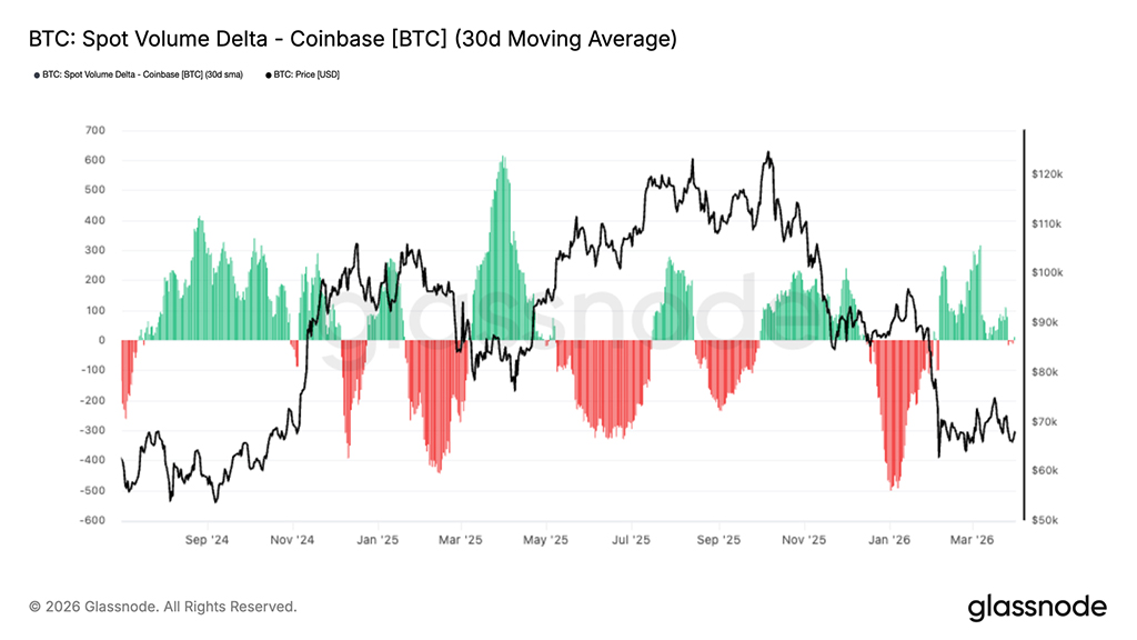 На спотовых рынках наблюдаются первые признаки стабилизации: 30-дневная скользящая средняя дельты объема спотовых операций Coinbase в последних данных незначительно выросла в положительную сторону. Это произошло после продолжительного периода отрицательных значений в январе и начале февраля, когда сохранялось давление со стороны продавцов, отражающее продолжающееся распределение.