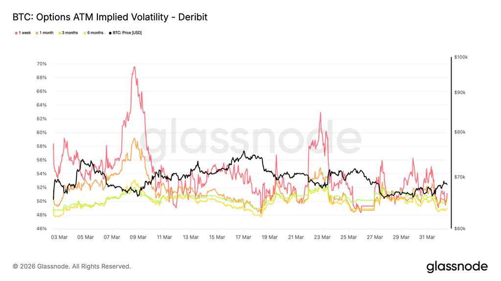 После пересмотра позиций на рынке опционов, первым заметным изменением становится подразумеваемая волатильность. Структура волатильности биткоина по срокам погашения снизилась по сравнению с прошлой неделей, при этом наибольшее падение наблюдается на ближайшем сроке. Подразумеваемая волатильность для 1-недельных опционов (ATM) сейчас составляет 51%, а для 3-месячных — 49%, при этом другие сроки погашения находятся в промежуточном диапазоне, включая 6-месячные — 49,8%, что указывает на заметно сжатую структуру сроков погашения.