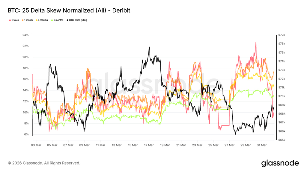 Такое расхождение во взглядах на разные сроки погашения весьма показательно. Хотя спрос на краткосрочное хеджирование несколько снизился после недавней стабилизации, среднесрочные и долгосрочные стратегии защиты по-прежнему пользуются высоким спросом. Рынок не завышает цены на крупные колебания, но постоянно уделяет больше внимания рискам снижения стоимости активов по всей кривой, что указывает на устойчивую защитную тенденцию, а не на временную реакцию.