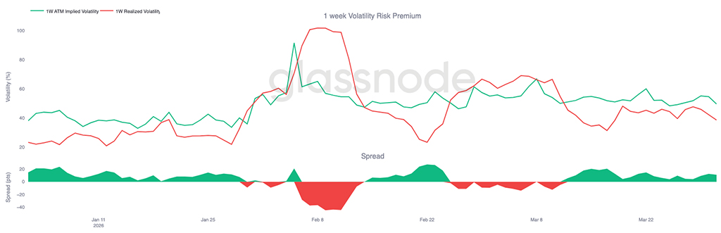Нестабильность этой ситуации объясняется тем, что подразумеваемая волатильность продолжает торговаться выше реализованной волатильности. На ближайшей позиции реализованная волатильность за 1 неделю составляет 38%, а подразумеваемая волатильность за 1 неделю — 49%, что составляет спред в 11 пунктов. Этот разрыв сохраняется уже более трех недель, что указывает на то, что опционы постоянно оцениваются выше фактического движения рынка.