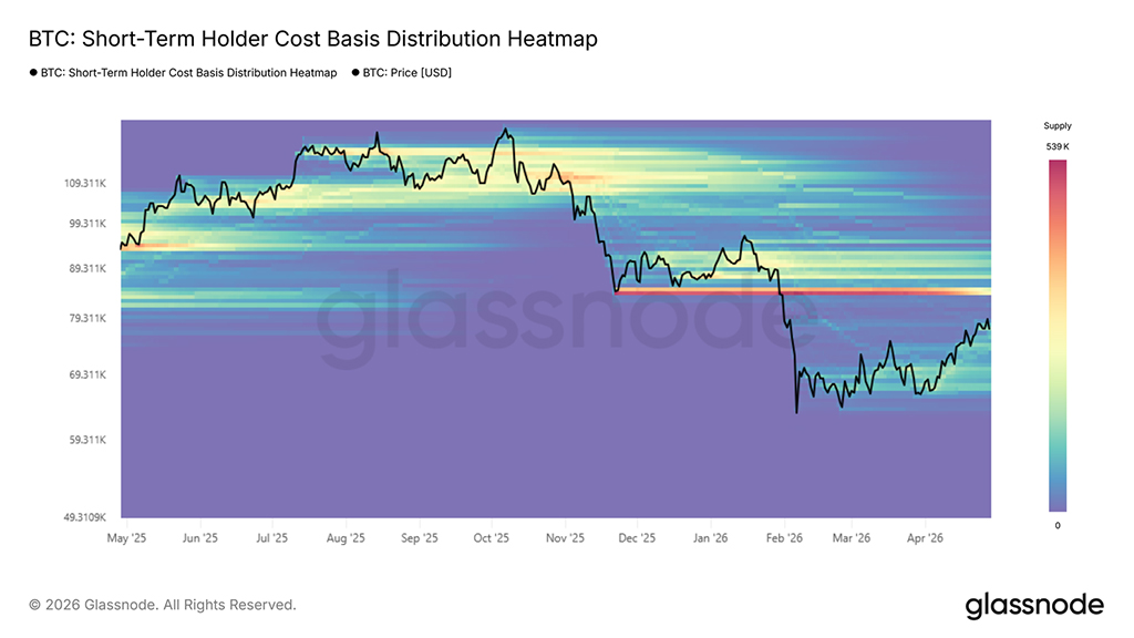По мере приближения цены к $80000 этот показатель вырос примерно до $4 миллионов в час, что примерно в четыре раза превысило базовый уровень, установившийся с середины апреля, подтверждая, что краткосрочные держатели восприняли рост как возможность для распределения прибыли. Покупателям просто не хватило ликвидности, чтобы поглотить эту волну реализации прибыли, что ограничило импульс и спровоцировало последующее отторжение.